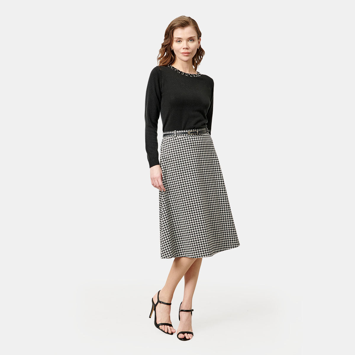 En esta colección, los tejidos suaves y estructurados se convierten en un lienzo para estampados atemporales como el clásico pata de gallo, que se reinventa en blanco y negro para un toque chic. Además, encontrarás estampados geométricos y florales que añaden un toque de color y vitalidad a tu guardarropa. La paleta de colores es un abrazo cálido y moderno: neutros como el beige y el camel que se unen a tonos tierra profundos como el verde y el verde azulado, mientras que acentos vibrantes en azul y morado intenso aportan un toque de audacia.